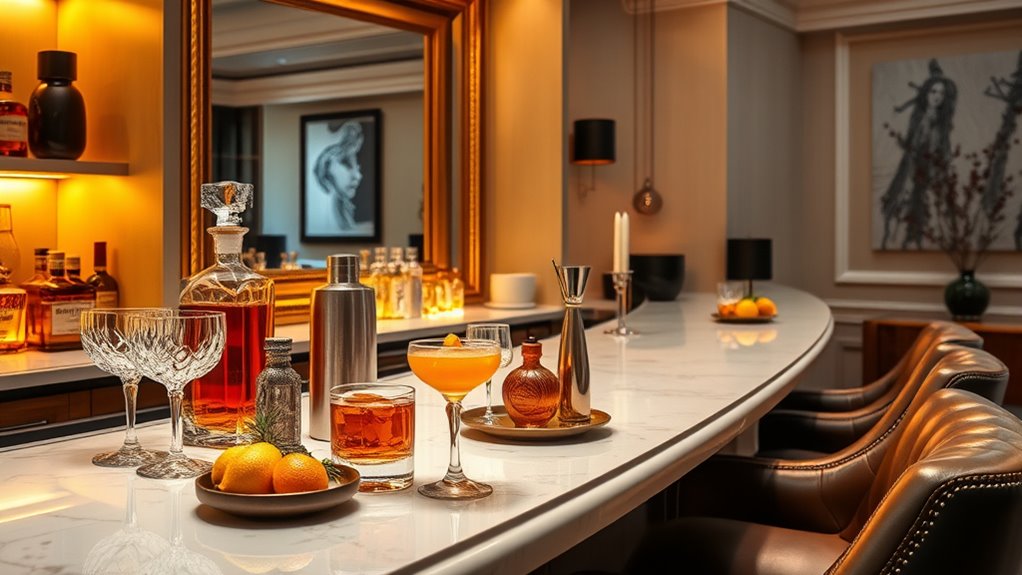 You can personalize your luxury bar setup by adding unique glassware, custom cocktail shakers, and personalized coasters that reflect your style. I love incorporating signature drinks with special ingredients or garnishes that match your theme. You could also display photos or mementos that tell your story. These touches make your space feel more inviting and memorable for your guests, turning every visit into a special experience.