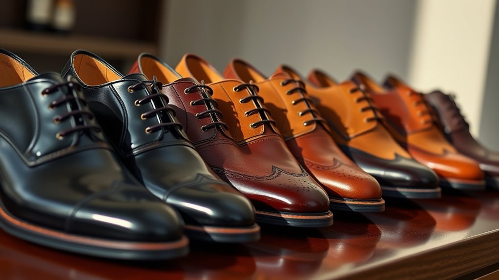 To get the most value from your luxury men’s dress shoes, it’s essential to select styles that work seamlessly across various occasions. Opt for versatile designs like classic oxfords or loafers, which are suitable for weddings, business meetings, and evening outings. Neutral colors such as black, brown, or tan are ideal because they easily coordinate with different wardrobe options. Look for shoes that shift smoothly from daytime professional settings to evening social events, ensuring you’re always appropriately dressed. Prioritize quality craftsmanship and timeless design, so your shoes remain stylish and relevant across multiple occasions without looking outdated. This approach guarantees you make a smart investment, maximizing utility and elegance with every pair.