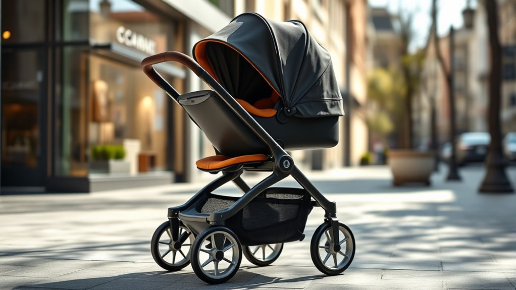 Choosing a luxury stroller that’s easy to maneuver makes everyday outings much simpler. I look for models with large wheels and shock absorption to handle uneven terrain smoothly. An adjustable handlebar is a must—it’s more comfortable and gives better control, especially on busy streets. Lightweight frames, like those made from carbon fiber, make pushing and turning effortless without sacrificing strength. Multi-directional or reversible seats let me switch between parent-facing and outward-facing positions easily, enhancing convenience. I also prefer strollers with one-hand steering or quick-fold mechanisms—they’re perfect for navigating crowded spaces and storing compactly. When a stroller combines these features, I feel confident that I can get around effortlessly, making outings more enjoyable for both of us.