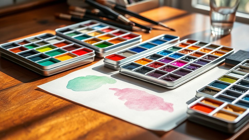 Selecting a luxury watercolor set with excellent packaging and portability guarantees I can create art anywhere without hassle. I look for sets in compact, durable cases or boxes that make transportation easy and storage simple. Built-in compartments, mixing trays, or palettes are a plus—they keep everything organized and accessible. I also consider the weight and size, ensuring the packaging is lightweight enough for travel and outdoor painting sessions. Some sets include handy accessories like water brushes, sponges, or collapsible cups, which boost convenience when painting on the go. I prefer designs that combine beauty with practicality, so my set is both attractive and resilient enough to withstand frequent use. Good packaging means I can focus on creating, no matter where I am.
