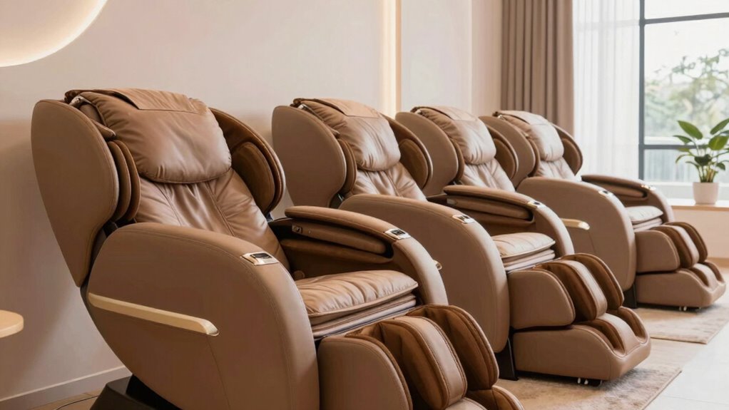 Therapeutic functionality options play a vital role in selecting the right luxury wellness chair for seniors, as these features can greatly enhance comfort and health benefits. Many chairs offer massage functions that target multiple zones like the back, lumbar, thighs, and legs, with adjustable modes and intensities to suit individual needs. Heat therapy is often included, especially in the lumbar or calf areas, to promote blood flow and muscle relaxation. Zero-gravity recline positions are common, allowing the chair to tilt into weightless postures that reduce pressure on the spine and joints. Some models incorporate air compression massage with full-body airbags, providing gentle, rhythmic pressure to improve circulation and reduce stiffness. Customization via remote or touchscreen interfaces guarantees treatments are tailored for maximum comfort and therapeutic effect.