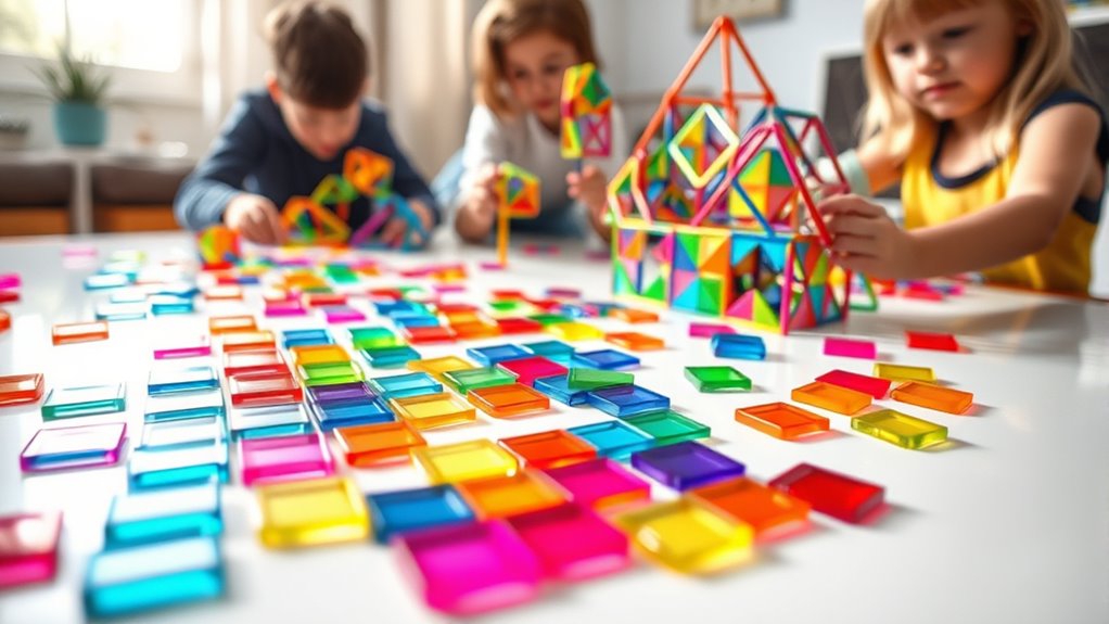Choosing the right magnetic tiles can substantially boost a child’s learning experience, as these toys do more than just entertain—they develop essential skills. These tiles improve fine motor skills and hand-eye coordination as kids manipulate and connect the pieces, fostering better control and precision. They also promote spatial reasoning and an understanding of geometric concepts through three-dimensional building. Certification from organizations like Dr. Gummer’s Good Play Guide and The Toy Association underscores their educational value. Magnetic tiles encourage open-ended, child-led play, which sparks creativity, enhances problem-solving, and supports cognitive development. Plus, using high-quality, non-toxic materials makes them safe, durable tools that can be enjoyed for years. Overall, magnetic tiles are powerful learning aids disguised as fun.