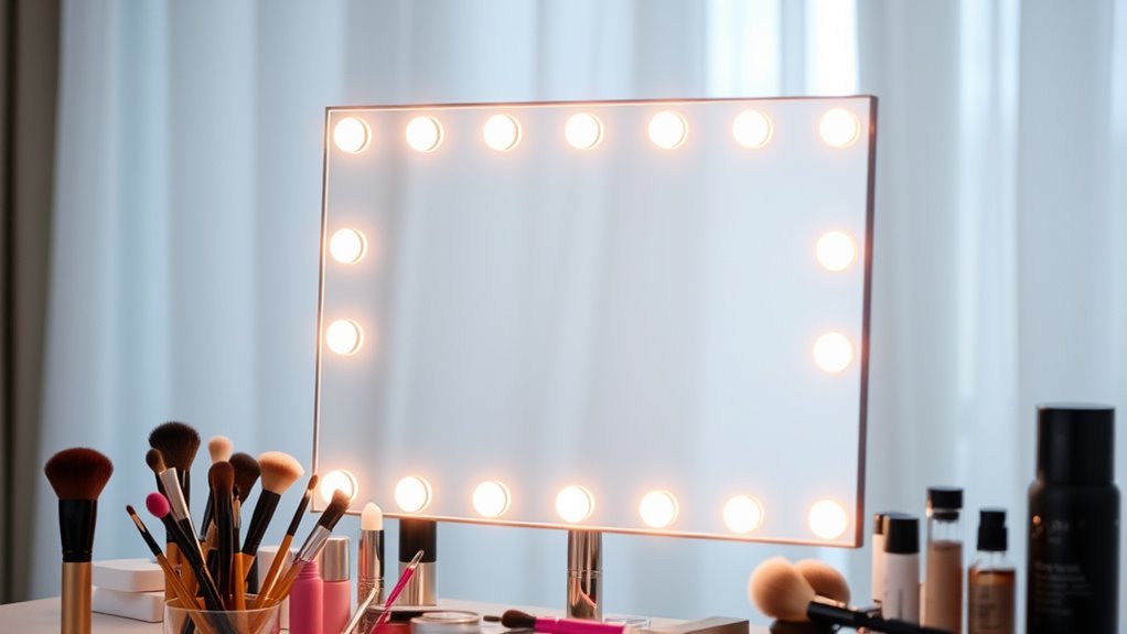 When considering a makeup mirror with lights, size and portability play a significant role in ensuring it fits seamlessly into your routine and space. I recommend choosing a size that aligns with your needs—whether you want a full-face view or detailed close-ups. Portable mirrors range from compact travel-sized options to larger, wall-mounted models. If you travel often, a lightweight, foldable design makes transport easier, but if it’s for a permanent setup, a larger mirror might suit your vanity better. Pay attention to weight—heavier mirrors can be cumbersome to carry. Also, consider how the mirror’s dimensions complement your space to avoid clutter. An adjustable or foldable feature can enhance portability without sacrificing functionality, making your beauty routine more flexible.
