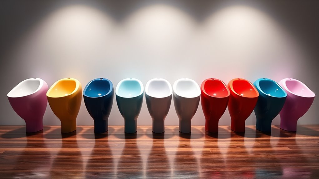 These urinals are made from durable materials like high-grade plastic or stainless steel, similar to how a sturdy backpack holds up on a long hike. I’ve found that these materials guarantee they’re lightweight yet robust enough for repeated use. Some even have special coatings to resist stains and odors, which I appreciate. Overall, the quality of the materials makes a big difference in both convenience and cleanliness during use.