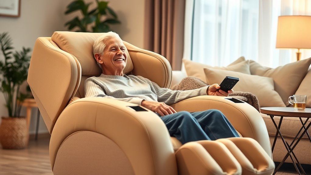 Safety features are essential considerations to guarantee seniors can enjoy massage chairs without worry. Auto shut-off timers prevent overheating and overuse, minimizing risks during extended sessions. Emergency stop buttons provide immediate control if discomfort or safety concerns arise, offering peace of mind. Non-slip bases and secure recline mechanisms help prevent accidental falls or tipping, ensuring stability during use. Adjustable intensity settings allow seniors to customize massage strength, avoiding pain or overstimulation. Built-in sensors and body detection technology ensure proper positioning, reducing the risk of injury from incorrect use. These safety features work together to create a secure environment, allowing seniors to relax and benefit from their massage without concerns about safety hazards or misuse. Prioritizing these elements is key to choosing a reliable, safe massage chair.