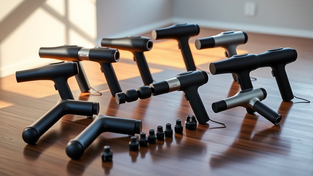 Ever wondered how the variety of attachments can enhance your muscle recovery routine? Different massage heads, like ball, flat, bullet, and fork, let you target specific muscle groups and tissue types for a more personalized treatment. Having multiple attachments means you can easily switch between deep tissue work, gentle relaxation, or trigger point therapy, making your recovery more versatile. Devices with a good selection of heads are better suited to address unique needs, whether it’s easing shoulder knots or massaging calves effectively. The ease of changing attachments—whether screw-in or click-on—also impacts how quickly you can customize your session. Overall, a wider range of heads makes a massage gun more adaptable, helping you target various pain points and recovery goals with ease.