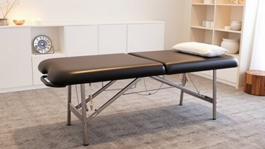 An adjustable height range is key to guaranteeing both therapist comfort and client relaxation during treatments. I look for tables with a range of at least 24 to 34 inches to promote ergonomic positioning and reduce strain. A broader adjustment spectrum offers more versatility for different treatment types and personal preferences. Precise control, often via electric motors or remote, allows quick and smooth height changes, which keeps sessions flowing seamlessly. Quiet adjustments are essential to avoid disruptions and keep clients comfortable. A height adjustment range of at least 10 inches helps accommodate users of various sizes and working environments. This flexibility ensures I can adapt the table easily for different clients and treatments, ultimately enhancing both my comfort and the overall therapy experience.