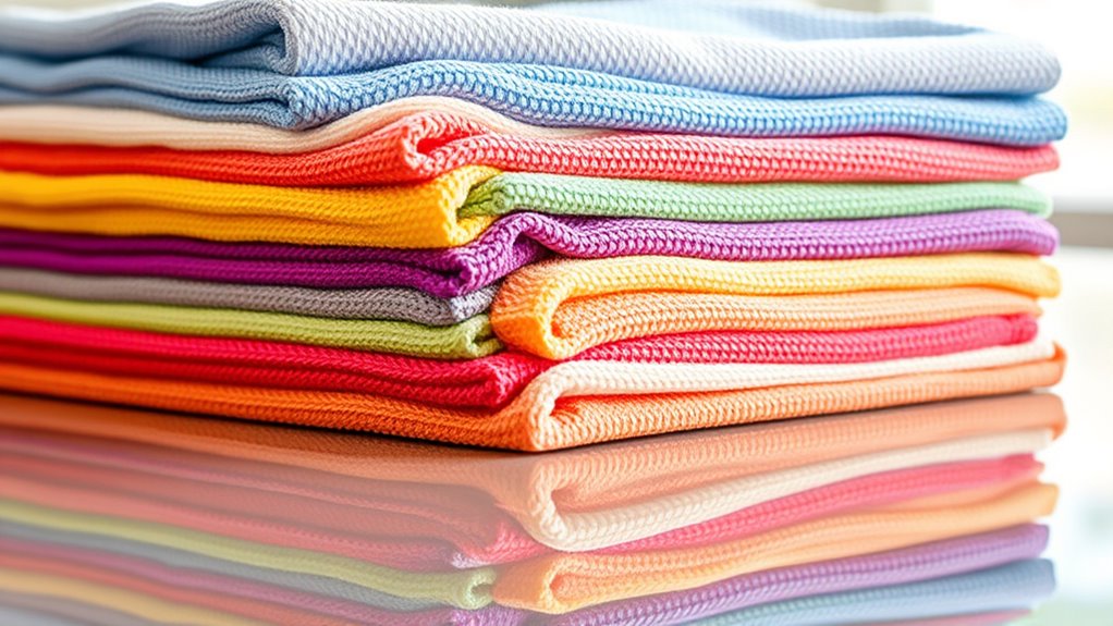 Proper cleaning and care are essential to keep microfiber cloths working effectively over time. Always follow the manufacturer’s washing instructions, usually machine wash in warm water without bleach or fabric softeners, to safeguard the fibers. Wash microfiber cloths separately from other laundry to prevent lint transfer and maintain their cleaning power. Proper drying—either air drying or tumble drying on low heat—helps preserve their softness and absorbency. Avoid using fabric softeners or bleach, as these chemicals can break down microfiber fibers and reduce performance. To ensure longevity and hygiene, replace or deep-clean your microfiber cloths after roughly 500 washes. Consistent care keeps them effective, durable, and ready to make your cleaning tasks easier and more efficient.