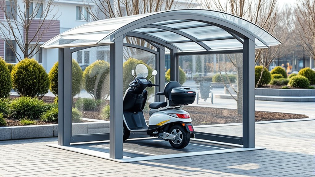 Yes, weatherproof shelters can substantially boost your scooter’s security, acting like a fortress protecting your investment. I’ve seen how a sturdy shelter discourages theft and vandalism, giving me peace of mind. When your scooter is sheltered, it’s less tempting for thieves and less exposed to the elements, which means it stays safer and lasts longer. It’s like giving your scooter a cozy, secure home away from harm.
