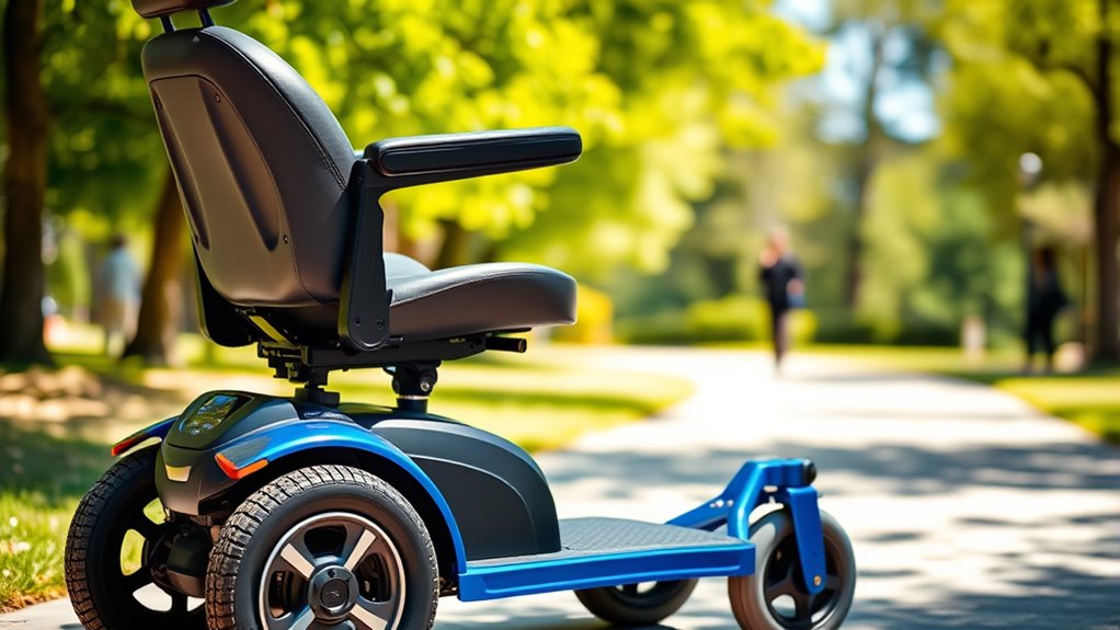 Think of safety features as the sturdy helmet and seatbelt for your mobility journey. Essential ones include anti-tip wheels to prevent falls, reliable brakes for quick stops, and bright lights for visibility. Seat belts keep you secure, while sturdy tires handle uneven terrain. Reflectors and alarms add extra layers of safety, making your ride smoother and safer. These features are your shield for confident, secure independence.