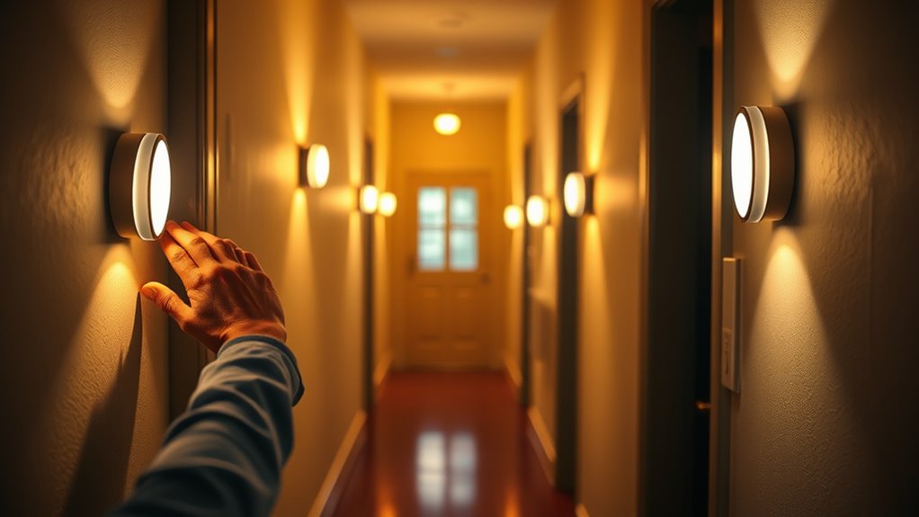 When it comes to installing motion sensor night lights for seniors, ease of setup is essential. I always recommend choosing models that feature a simple plug-in or portable design. This way, no tools or wiring are needed, making the process quick and hassle-free. Look for lights with straightforward controls, like touch or slide switches, which allow for easy adjustments in mode and brightness. Clear, step-by-step instructions can also reduce errors during installation. I prefer lights with automatic sensors that activate in low light, minimizing manual effort. Additionally, consider options with adjustable sensor sensitivity and timer settings. This customization guarantees the lights operate effectively without triggering unnecessarily. With these features, setup becomes a breeze, enhancing safety and convenience.