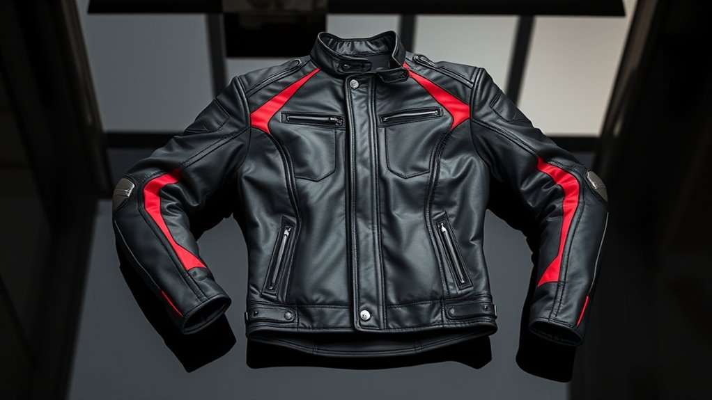 Proper maintenance is essential to keep a motorcycle jacket in top condition and guarantee it continues to protect and look good. Regular cleaning, following the manufacturer’s instructions, is key—avoid harsh chemicals that can damage materials. Faux leather jackets should be hand-washed or spot cleaned, as dry cleaning or ironing can cause damage or creases that are hard to remove. Genuine leather jackets benefit from conditioning with leather-specific products to maintain flexibility and prevent cracking over time. Proper storage, like hanging jackets in a cool, dry place away from direct sunlight, helps preserve their appearance and structural integrity. Additionally, routinely inspecting for tears, loose stitching, or damaged zippers ensures safety and extends the jacket’s lifespan. Proper care keeps your jacket protective, stylish, and durable.