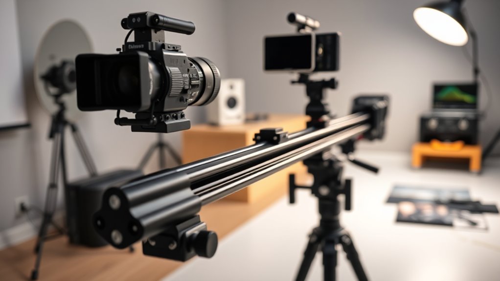 Choosing a motorized camera slider with durable build materials is essential for guaranteeing reliable performance, especially during demanding shoots. Materials like aluminum alloy, carbon fiber, and CNC-machined metals directly impact the slider’s resistance to wear, environmental conditions, and repeated use. Carbon fiber is lightweight yet incredibly strong, providing high durability and stability while keeping the setup portable. Aluminum alloy offers a solid balance of strength and affordability, resisting bending and corrosion over time. CNC-machined metal components ensure precise construction, reducing the risk of mechanical failure and supporting long-lasting performance. Investing in high-quality, impact-resistant materials not only extends the lifespan of your slider but also guarantees consistent results in outdoor or rugged environments. Durability is key to smooth, reliable B-roll footage.