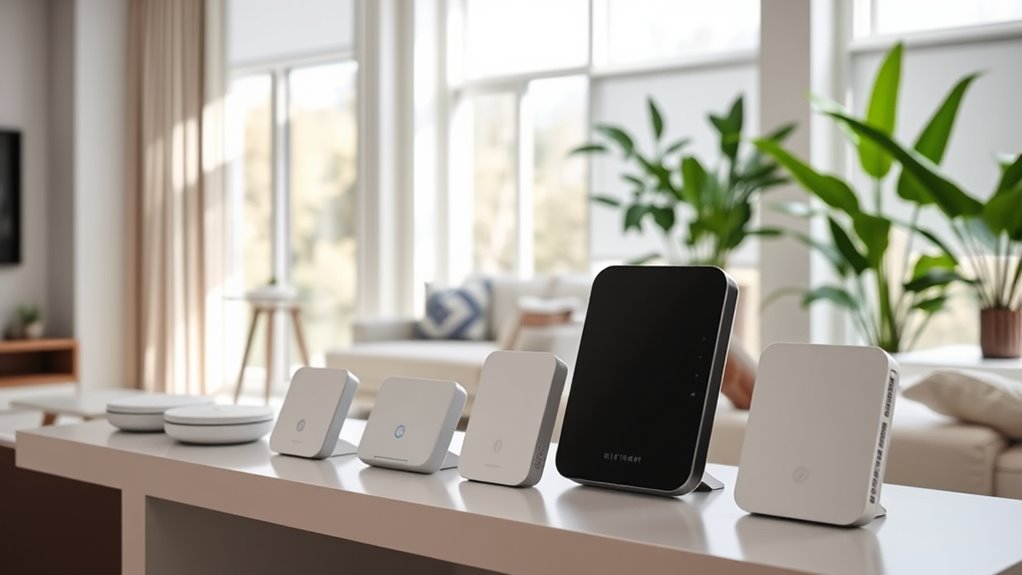 Accurately measuring your home’s square footage and layout is essential for selecting a multi-room Wi-Fi mesh system that meets your coverage needs. If you live in a larger home or a multi-story building, look for systems that cover over 5,000 sq ft with multiple nodes. I’ve noticed that open floor plans usually require fewer nodes, while homes with many walls or obstructions might need extra units. Don’t forget to take into account outdoor areas, garages, or basements when estimating coverage; you might need outdoor or extended range nodes. Additionally, the number of devices and simultaneous users can substantially impact your coverage needs. More devices may require a system designed for high device density over larger areas to ensure seamless connectivity.