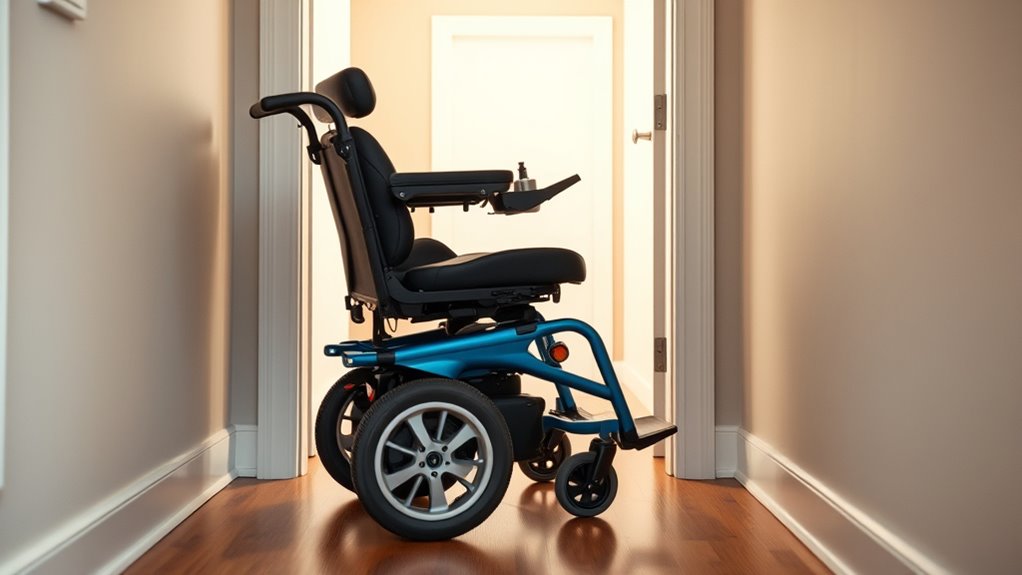 Choosing a narrow power wheelchair means paying close attention to its overall dimensions to guarantee it fits comfortably through small doorways. Typically, these wheelchairs measure between 22 and 24 inches in width, ensuring they can pass through standard doorways of 24 to 32 inches. Their compact design often results in a length of around 35 to 40 inches, which helps with maneuverability in tight spaces. Slim profiles are achieved through streamlined frames and minimalistic armrest and footrest setups. Precise measurements are vital; even a small difference can make the difference between easy navigation and difficulty. By focusing on these dimensions, I can select a wheelchair that combines comfort with the ability to maneuver seamlessly through narrow passages, making everyday mobility safer and more efficient.