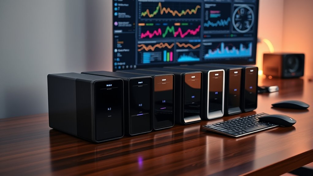Choosing a NAS device with strong expandability potential guarantees your storage can grow alongside your needs. I look for units that support additional drive bays, NVMe SSD caches, or external storage options, as these features enable seamless scalability. The maximum number of supported drives and the availability of expansion slots directly impact how much the NAS can expand in the future. I also consider scalable storage architectures like RAID configurations and drive enclosures, which provide flexible options for data management. Modular designs and hybrid storage options are particularly appealing, as they offer greater adaptability to evolving data demands. Prioritizing expandability ensures my investment remains relevant, allowing me to upgrade and add storage without replacing the entire system down the line.