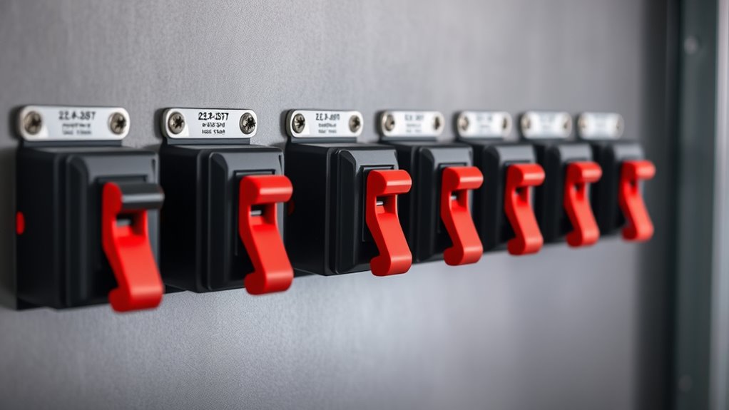 When installing an NEC 230.85 emergency disconnect switch, accessibility is crucial for quick and safe operation during emergencies. I always ensure the switch is placed near the equipment it controls, so it can be reached easily. Mounting it at a height between 4 and 5 feet from the floor makes it reachable for most personnel. I also check that the switch isn’t obstructed by other objects and is in a well-lit area, allowing immediate visibility. It’s important to follow local electrical codes and standards to guarantee proper placement. Clear access and proper positioning can make the difference between a quick response and a dangerous delay. Prioritizing ease of access helps ensure safety and compliance during critical moments.