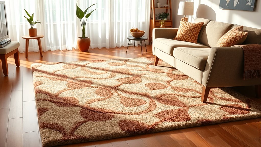 To choose the right size for different rooms, I measure the space first and consider how much area I want covered. For small rooms, I go for smaller rugs that don’t overwhelm the space, while larger rugs work well in bigger areas to create a cozy feel. I also think about furniture placement—making sure the rug complements the layout without blocking walkways or furniture legs.