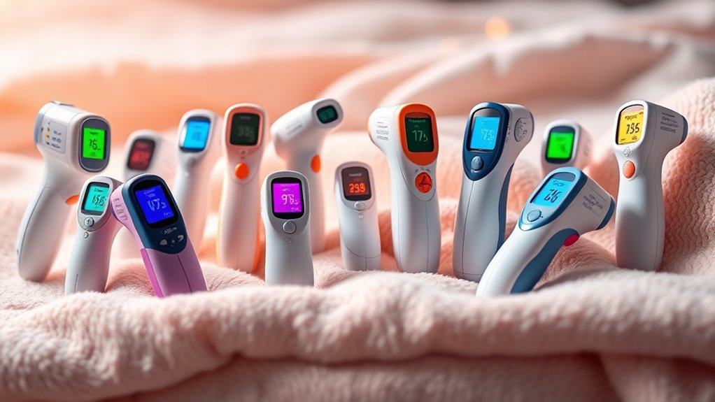 Ergonomic designs with lightweight, non-slip grips make handling easier and more comfortable. Features like backlit screens and mute modes help minimize distractions, while color-coded fever alerts provide quick visual feedback. Clear instructions and the ability to take readings in about a second ensure you get accurate results without unnecessary hassle. These user-friendly features will definitely enhance your experience.