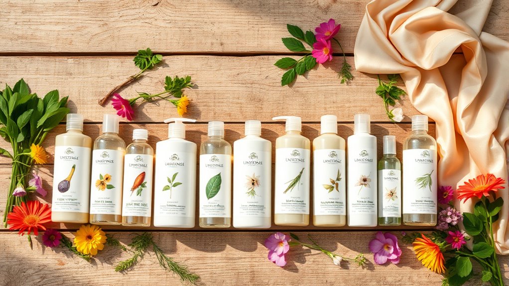 When it comes to selecting organic hair care products, understanding formulation and safety standards is vital for making informed choices. I always check for products that avoid synthetic chemicals, parabens, sulfates, and artificial fragrances. Look for certifications from reputable organizations like USDA Organic or COSMOS, which guarantee the product meets strict safety and ingredient quality criteria. A label that says “organic” usually means at least 95% of the ingredients are organic, confirming authenticity. I prefer products that use natural preservatives and plant-based extracts, as they’re gentler on the skin and reduce chemical exposure. Finally, transparent ingredient lists and third-party testing are essential for verifying safety and compliance with organic standards, making sure I’m choosing the best for my hair.