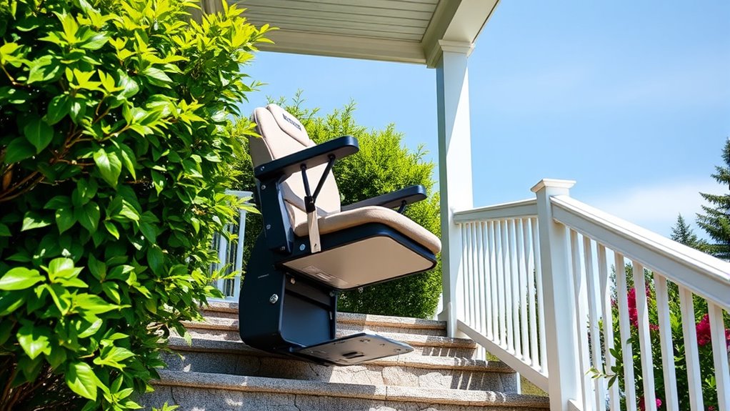 Choosing the right outdoor stair lift for seniors means prioritizing safety features that prevent accidents and guarantee peace of mind. I look for models with anti-slip surfaces, sturdy handrails, and secure seat belts to reduce the risk of falls and injuries. Reliable sensors and automatic brakes are essential—they stop the lift if an obstacle is detected or if it malfunctions. Weather-resistant components and corrosion-proof materials ensure safety isn’t compromised by outdoor elements, maintaining durability and stability over time. Proper safety railings and secure footrests add extra support, minimizing slips or missteps. Additionally, I check that the lift meets safety standards and has proper certifications, giving me confidence that it adheres to necessary regulatory requirements for senior use.