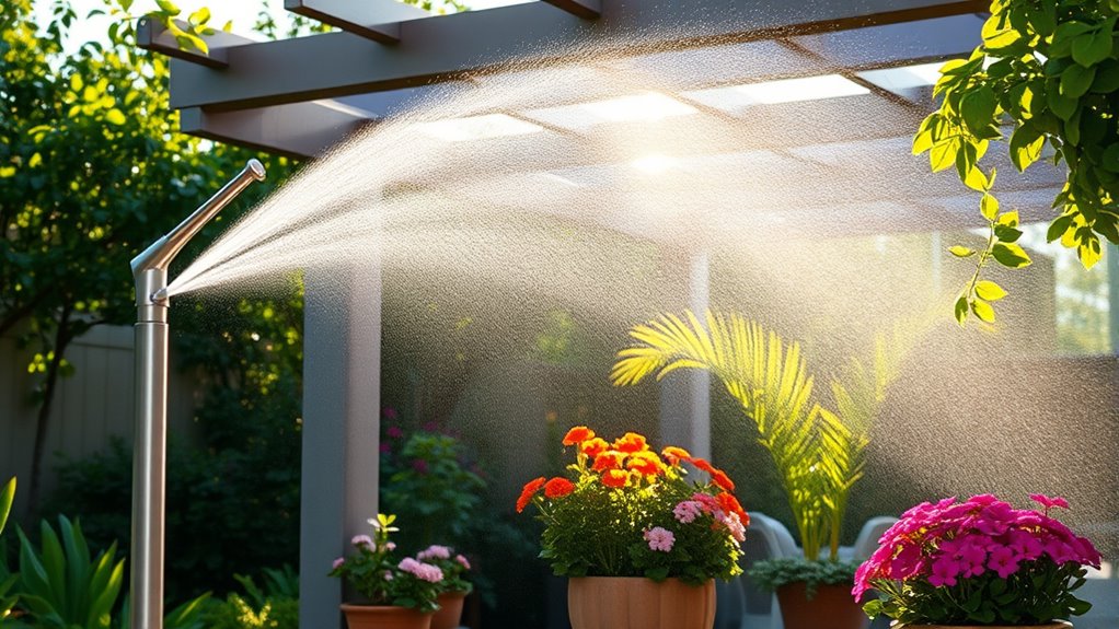 Ensuring your patio misting system has the right water pressure is vital for effective cooling. Most systems need at least 30-50 PSI to produce fine mist droplets that efficiently lower temperatures. If the pressure is too low, misting becomes inconsistent, leading to uneven cooling and potential nozzle clogging. High-pressure systems, which often use pumps capable of exceeding 100 PSI, deliver a more consistent, finer mist for maximum cooling. Using an adjustable pressure regulator helps control water flow, keeping pressure within the recommended range for peak performance. Proper water pressure not only guarantees effective heat relief but also helps prevent leaks and protects system components, extending its lifespan. Paying attention to water pressure needs is an essential step in choosing the right patio misting system.