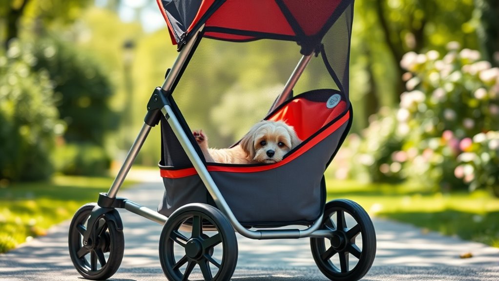 Have you considered how your usual walking routes might influence your choice of a pet stroller? If you often stroll through parks with gravel or grassy paths, look for strollers with large pneumatic tires or all-terrain wheels. These provide better stability and absorb shocks on uneven surfaces. For smooth sidewalks and pavements, smaller wheels may suffice, but adding features like lockable swivel wheels can improve control on slopes or uneven patches. Consider a stroller with a suspension system to cushion your pet from bumps and jostling on rough terrain. Additionally, check that the frame and wheels are durable enough to handle outdoor elements like dirt, mud, and gravel without sacrificing safety or performance. Matching terrain compatibility to your outdoor environment ensures a smoother, more comfortable outing for your small dog.