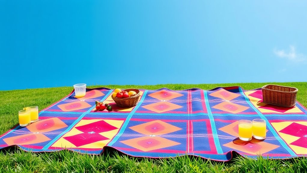 When it comes to maintaining your waterproof picnic blanket, ease of cleaning makes all the difference. I look for blankets that can be simply shaken or wiped to remove dirt, grass, or spills, saving me time and effort. Quick-drying materials are a bonus, letting me clean up and pack away fast after outdoor use. I also prefer blankets that are machine washable or have straightforward spot-cleaning instructions, ensuring they stay hygienic and looking fresh. Stain-resistant surfaces are a game-changer, reducing the need for frequent deep cleaning. Additionally, foldable designs with handles or straps make transport and storage hassle-free, keeping the blanket clean during transit. Overall, choosing easy-to-clean options helps me enjoy outdoor meals without worrying about tedious maintenance.