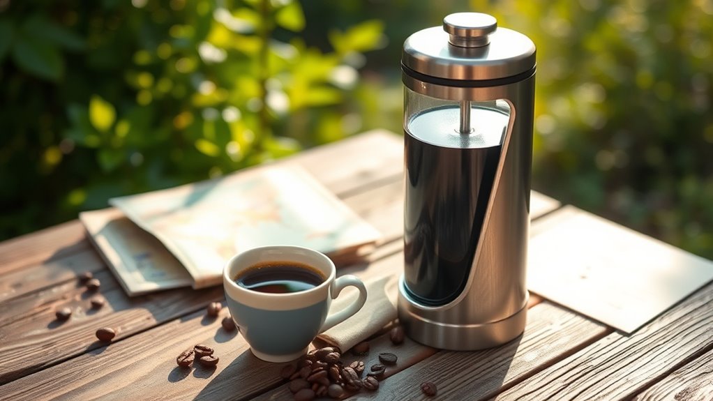 For travelers who want versatile brewing options in a compact package, the AeroPress Original Coffee Press stands out as an ideal choice. It combines French press, pour-over, and espresso styles into one lightweight, durable device. Using patented 3-in-1 technology, it speeds up extraction while delivering rich, smooth coffee with minimal bitterness. Brewing takes less than two minutes—just add coffee and water, press, and enjoy. Cleaning is simple—eject the grounds and rinse. Its customizable settings let you experiment with different styles, from espresso to cold brew. Compact and shatterproof, AeroPress fits easily into any bag, making it perfect for coffee lovers on the go.