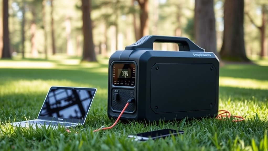 Since noise can be a major concern when using a portable inverter generator around sensitive electronics, I pay close attention to its decibel (dB) rating. Generally, quieter models operate below 60 dB, helping to minimize disturbance. Some units run as quietly as 52.5 dB, similar to a normal conversation, making them ideal for campsites or residential areas. Noise levels can vary depending on the load; many generators include eco or silent modes that lower engine speed and reduce noise during lighter use. I also consider the noise measurement at a standard distance, usually 7 meters, to get an accurate comparison. A lower dB rating guarantees a peaceful environment and prevents noise complaints, which is essential when protecting sensitive electronics.