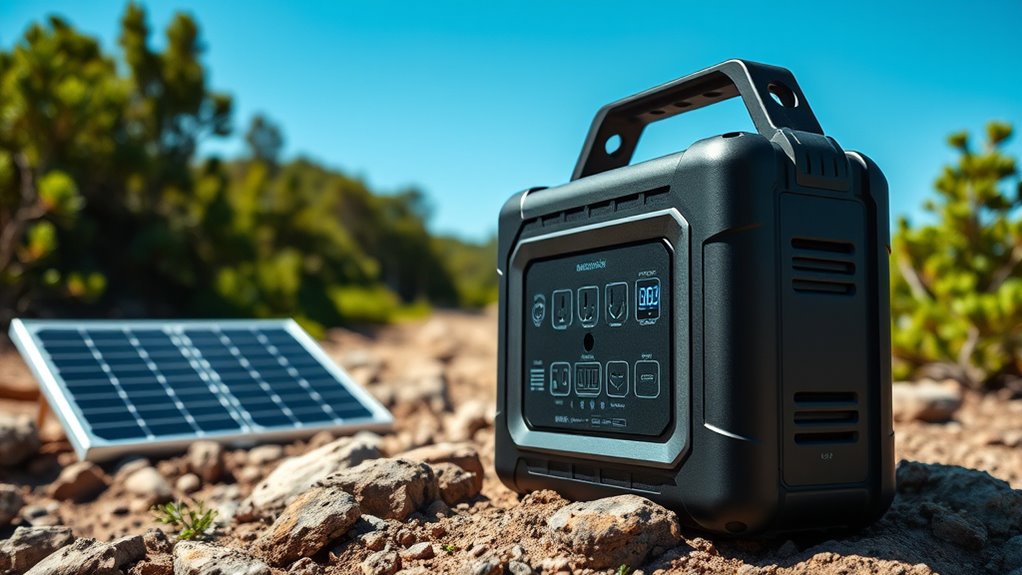 To guarantee your portable power station can handle outdoor conditions, prioritize models with an IP67 or higher rating for waterproof and dustproof protection. This ensures it can withstand rain, splashes, and dust without issues. Look for reinforced, impact-resistant casings to protect against drops and rough handling, which is common in outdoor environments. Check that ports and connectors are weather-sealed to prevent water ingress during rain or splashes. It’s also important to choose units with operating temperature ranges suited to your climate, ensuring reliable performance in extreme heat or cold. Additionally, units with built-in cooling systems or fans that run silently can help prevent overheating in hot weather, maintaining efficiency and longevity during extended use.