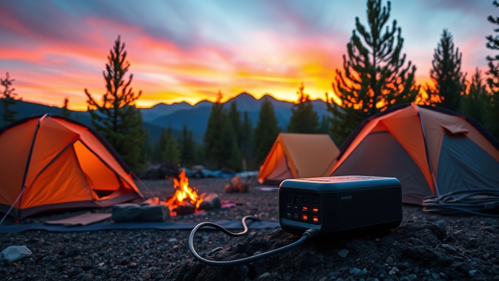 To guarantee your camping power station keeps your devices charged throughout your trip, it’s essential to take into account its charging options. I look for models supporting multiple methods like AC outlets, USB-C, USB-A, and car adapters, ensuring versatile energy sourcing. Fast recharging capabilities are a bonus; some units can reach 80% in under an hour via wall or solar input, saving time and keeping you powered longer. An integrated MPPT controller is also important, as it optimizes solar panel efficiency when charging off-grid. Additionally, I evaluate capacity and wattage output to match my device needs, making sure it can support essential electronics for the duration of my trip. Multiple output ports that allow simultaneous charging are a great feature to contemplate as well.