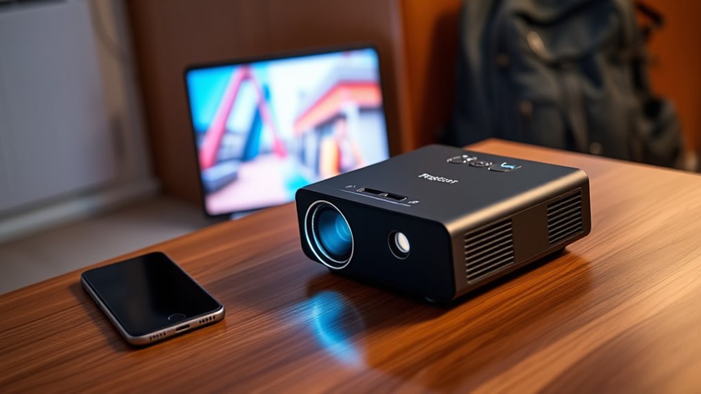 Most portable projectors are compatible with all smartphone types, but it’s not guaranteed. I’ve found that many use standard connections like HDMI, USB-C, or wireless options like Bluetooth and Wi-Fi, which most modern smartphones support. However, some older models might require adapters or specific apps. So, I always double-check the projector’s compatibility and connection options before I buy, to guarantee seamless use with my phone.
