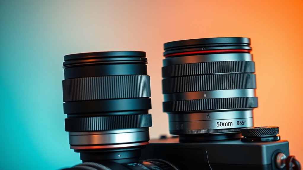 When selecting between 50mm and 85mm prime lenses for portraits, understanding how focal length influences composition is essential. The 50mm lens offers a natural perspective similar to what the human eye sees, making it versatile for various settings and close-up shots. It’s great for environmental portraits and tight spaces because of its forgiving nature. On the other hand, the 85mm lens provides a more compressed background and flattering facial proportions, enhancing the subject’s features. Its longer focal length creates beautiful background blur, isolating the subject for striking portraits. Your choice depends on the type of shot you want—50mm for versatility and proximity, or 85mm for depth and elegance. Consider your shooting distance and background separation goals to select the most suitable focal length.