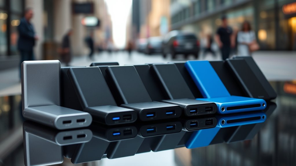 Choosing a power bank that can withstand daily use means paying close attention to its durability and build quality. I look for models with rugged, scratch-resistant surfaces and certified drop-test durability, so they can handle accidental drops and rough handling. High-quality materials like fire-retardant plastics and reinforced cables give me confidence in their safety and longevity. I also check the strength of port connections and built-in cables, ensuring they can endure over 10,000 bends without damage. Seamless, tight-fitting components prevent dust, water, and shock ingress, extending the device’s lifespan. Certifications or testing standards are important too—they verify that the power bank can handle harsh environments and extended use. Durability isn’t just about lasting; it’s about dependable performance every day.
