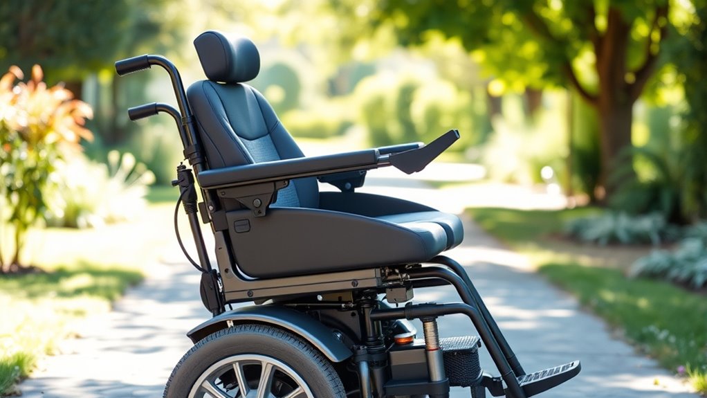Safety and stability are critical considerations when choosing a power wheelchair for seniors, as they directly impact confidence and independence. Features like handbrakes, seat belts, and anti-tip wheels are essential to prevent accidents and guarantee secure rides. A low center of gravity and a wide wheelbase greatly enhance stability across different terrains. Automatic braking systems that activate when controls are released help maintain control and prevent unintended movement. Additionally, a wheelchair’s ability to handle slopes and uneven surfaces—such as a 12° incline capacity—assures safe navigation outdoors. Regular maintenance and durable materials also contribute to long-term safety and stability. Prioritizing these features helps ascertain the wheelchair remains reliable and secure, giving seniors peace of mind during everyday activities.