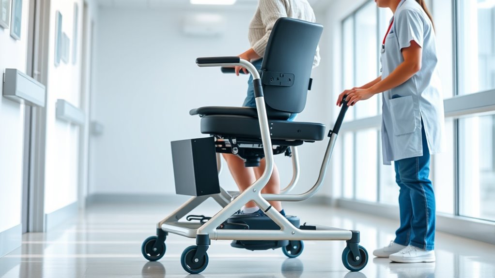Think of these aids as your trustworthy sidekick, always prioritizing safety. They include features like anti-tip mechanisms, secure locking joints, and sturdy frames to prevent falls. Many also have emergency stop buttons and adjustable settings for personalized support. These safety measures work together to give you confidence and stability during transfers, much like a reliable friend who’s got your back every step of the way.