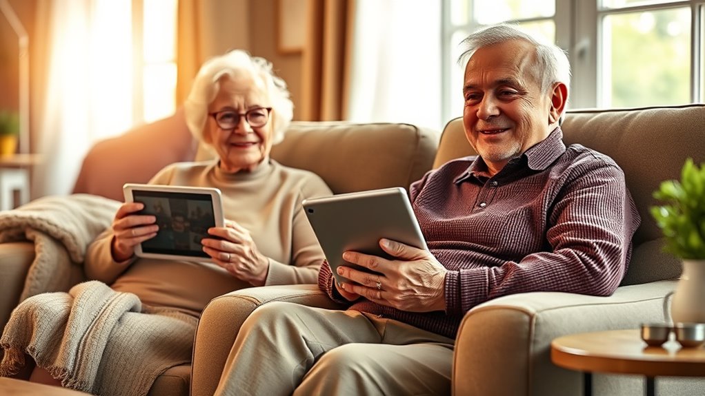 Think of it as a tailor-made suit—gifts should fit your parents’ health needs. For arthritis, consider heated blankets or ergonomic tools; for vision issues, large-print books or audio devices work wonders. For hearing impairments, try amplified phones or personal amplifiers. I recommend choosing practical, supportive items that improve daily life, just like a trusty steed from the past made travel easier—helping them stay comfortable and independent.