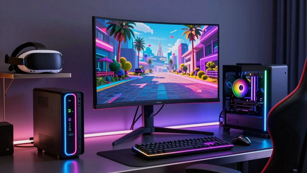 It’s pretty common for prebuilt PCs to support the latest VR headsets and accessories, especially if you buy from reputable brands. I’ve found that most come with the necessary ports and compatible hardware to handle new VR tech. However, I always double-check specs and compatibility lists to make certain I won’t run into issues later. Staying updated on firmware and drivers helps keep everything running smoothly, too.
