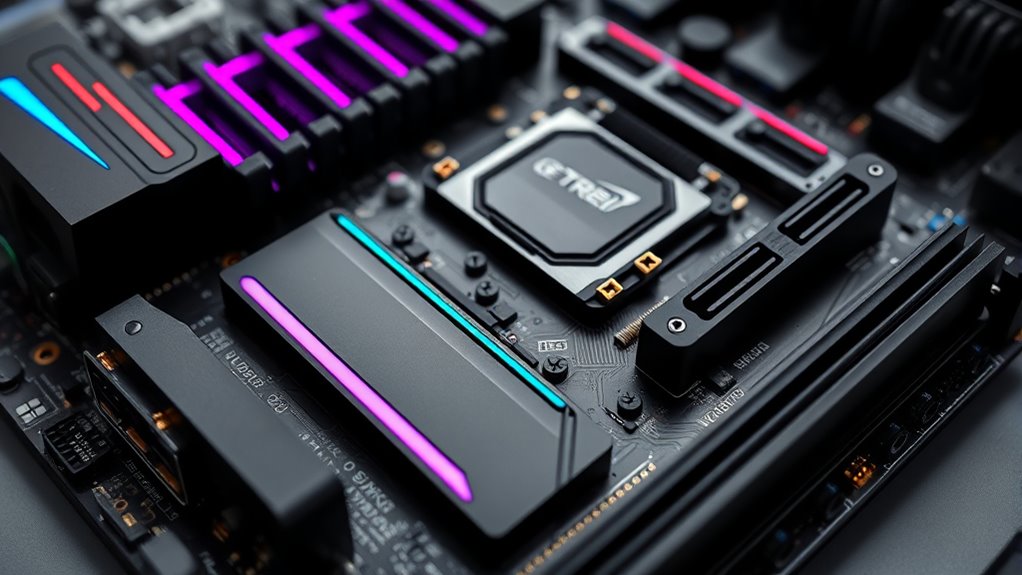 Effective cooling and thermal management are critical for ensuring your AMD motherboard performs ideally during intense gaming sessions. High-quality heatsinks, thermal pads, and heat pipes effectively dissipate heat from key components, preventing overheating. Proper airflow within the case, with well-placed fans and airflow channels, enhances heat removal and maintains stable temperatures. Robust VRM cooling, including dedicated heatsinks and active cooling, ensures consistent power delivery and prevents thermal throttling during overclocking or heavy loads. Features like M.2 heatsinks and PCH heatsinks help prevent SSD and chipset overheating, maintaining high-speed data transfer. Additionally, monitoring and customizing fan curves and temperature thresholds via BIOS or software tools allow for tailored thermal management, making certain your system stays cool and performs reliably during demanding gaming sessions.