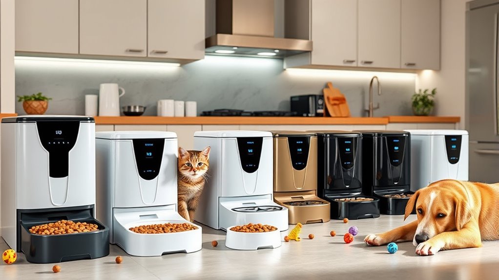 Understanding portion control options is essential for guaranteeing my pet gets the right amount of food at each meal. Premium automatic pet feeders usually offer adjustable portion sizes, ranging from as little as 1 gram to over 40 grams per meal. This flexibility lets me cater to my pet’s specific dietary needs. I can also choose feeders that allow multiple meals per day—up to 6 or more—which helps prevent overfeeding. Some models even allow for incremental adjustments, like 1/12 cup or 7-9 grams, perfect for pets of different sizes and health conditions. Plus, the ability to program and customize portions ensures a consistent feeding routine, which can considerably improve my pet’s health and behavior.
