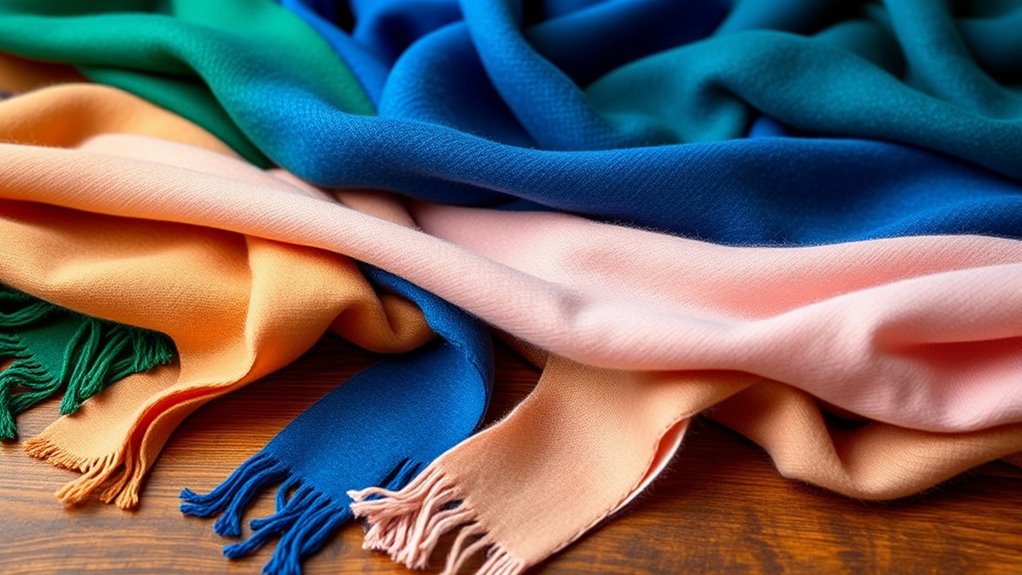 When selecting a premium cashmere scarf, considering the range of colors and styles available is essential to finding the perfect match for your wardrobe. These scarves come in a variety of shades, from timeless neutrals like black, beige, and gray to bold hues such as deep red, burgundy, and jewel tones. Style options include solid colors, intricate patterns, and textured weaves, making it easy to match different outfits and occasions. Seasonal palettes, like icy pastels for spring or warm earth tones for fall, help keep your look current. The design can also influence formality—minimalist styles suit professional settings, while patterned or fringed scarves add a casual touch. This variety allows for personalized choices that reflect your taste and complement your wardrobe.