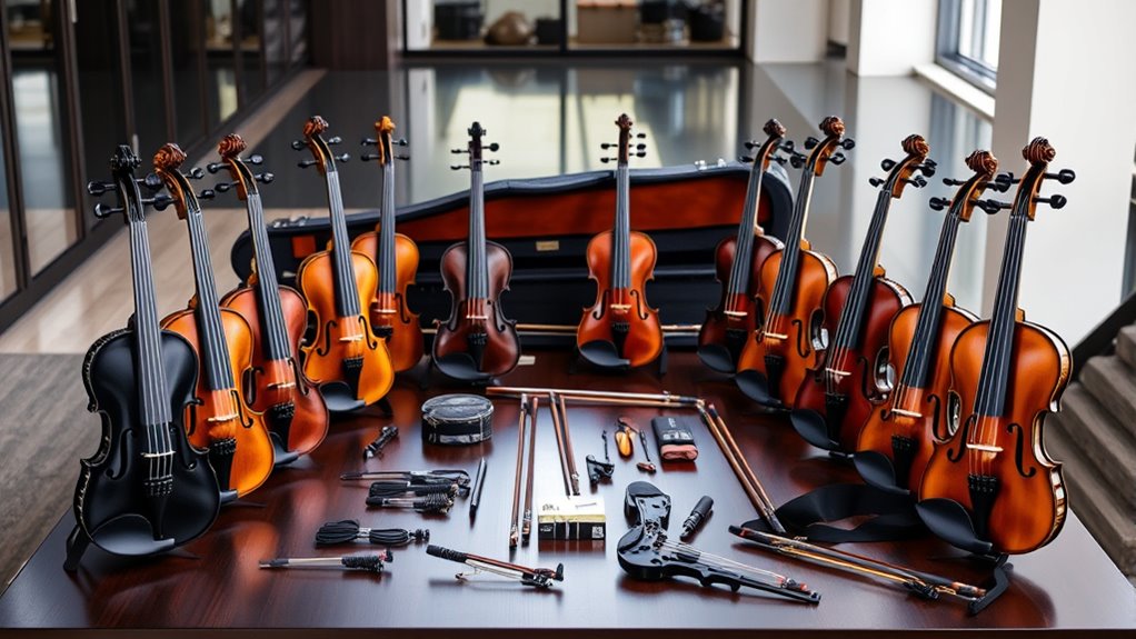 If you’re exploring the 15 best premium electric violin starter kits for aspiring musicians, I’d say they offer a great mix of high-quality materials, powerful electronics, and complete accessories to jumpstart your journey. From sleek designs to advanced sound controls, these kits cater to beginners and intermediate players alike. If you’re curious about the top options that balance style, sound, and durability, keep going—there’s plenty more to discover.