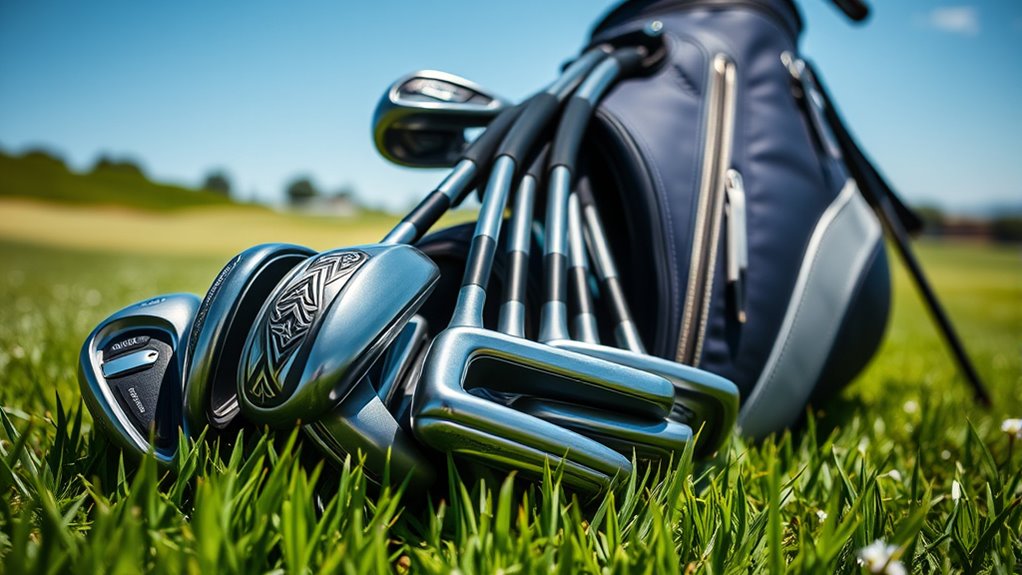 Advanced clubhead technology plays a essential role in optimizing your golf game by enhancing forgiveness, stability, and distance. Titanium and forged steel heads boost durability and create larger sweet spots, making off-center hits more forgiving. Perimeter weighting distributes weight around the edges, increasing stability and control on mishits. Features like variable face thickness and high-COR designs maximize ball speed and distance across the entire face. Modern clubheads often incorporate CNC milling or textured surfaces to improve spin control and shot precision. Additionally, aerodynamic shapes reduce drag, enabling faster swing speeds and better overall performance. These technological advancements help serious golfers achieve more consistent, powerful shots, making premium clubhead features a fundamental consideration when choosing the right set for your game.