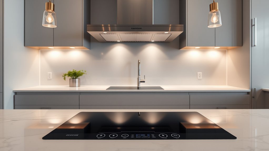 When considering a premium induction cooktop with integrated ventilation, safety and control features play a crucial role in guaranteeing a smooth and secure cooking experience. Look for auto-shutoff and residual heat indicators to prevent burns and accidents. Child safety locks add peace of mind in busy households. Precise control is essential, so choose models with sensor touch controls, multiple power levels, and adjustable timers for accurate cooking adjustments. Integrated ventilation systems with multiple fan speeds and automatic modes efficiently remove smoke, odors, and steam. Safety safeguards like auto-pan detection, overheat shutdown, and circuit failure protection ensure reliable performance during extended use. User-friendly interfaces with clear displays and responsive controls help maintain safe operation across various cooking scenarios, enhancing confidence and safety in your kitchen.