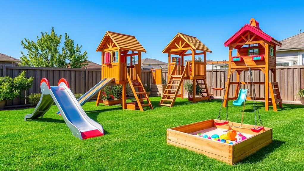 If you want to turn your yard into a playground paradise, I recommend exploring top-tier outdoor play equipment sets. These premium options feature durable cedar wood, weather-resistant plastic, and engaging components like slides, swings, climbing walls, and pretend play areas. They’re designed for safety, stability, and fun for kids of all ages. Keep in mind size and assembly ease to find the perfect fit. If you keep exploring, you’ll discover even more ways to create a fun backyard haven.