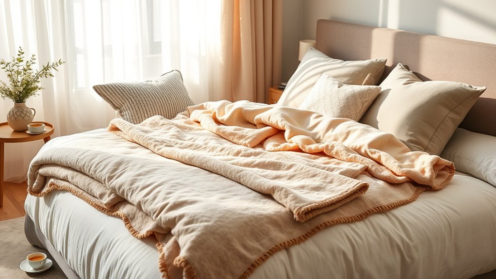 As I explore the therapeutic benefits of weighted blankets, I realize how they can markedly enhance sleep quality and overall well-being. They provide deep pressure stimulation, mimicking a comforting hug that promotes relaxation and reduces stress hormones. I’ve noticed that using a weighted blanket regularly improves sleep onset latency and extends REM sleep stages. This can be especially beneficial for those experiencing anxiety, insomnia, or even restless leg syndrome. It’s crucial to choose a blanket with the right weight—typically 7-12% of your body weight—and ensure the filling is evenly distributed for maximum effect. Consistent use can lead to lower cortisol levels and increased serotonin production, which considerably boosts mental well-being.