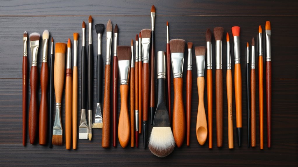 Did you know that natural hair brushes often hold more paint, making them ideal for detailed work? I find that sable brushes are perfect for fine lines and smooth blending, while synthetic brushes excel in bold strokes and acrylics. For textured, expressive styles, I prefer hog bristle. Choosing the right hair type depends on your painting style—each offers unique control and results, so experiment to find your perfect match.