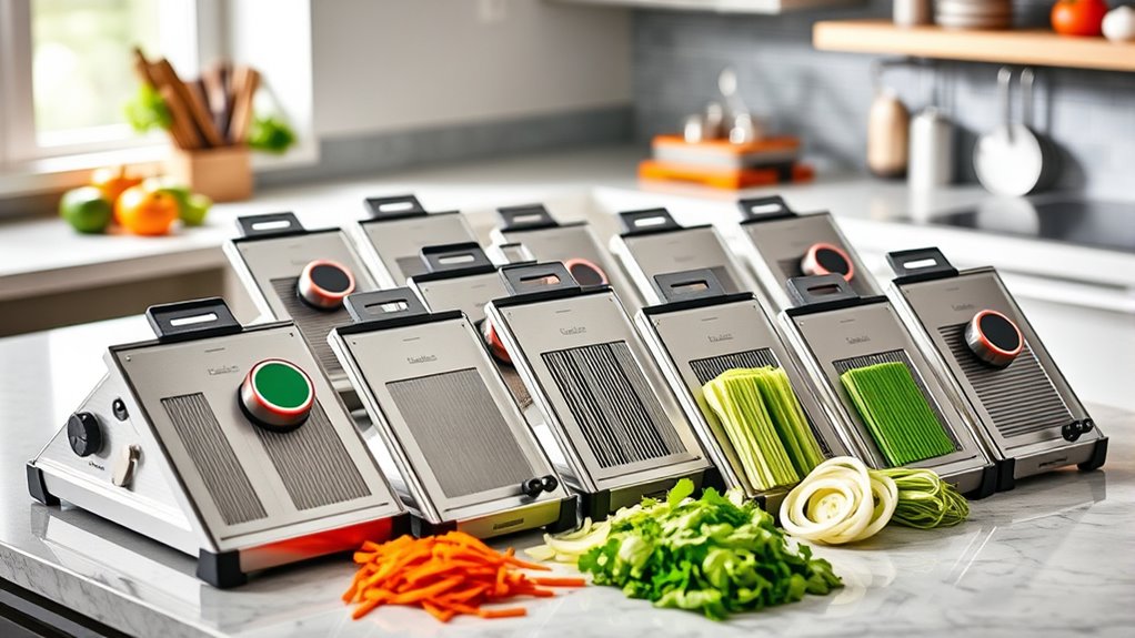Did you know that using the right blade can cut prep time by up to 50%? I always choose specific blades for different textures—ribbon blades for delicate herbs, julienne for carrots, and crinkle for potatoes. Selecting the correct blade not only improves safety but also guarantees perfect results. I recommend reading your slicer’s manual to match blades with food types, making your meal prep faster and more precise.
