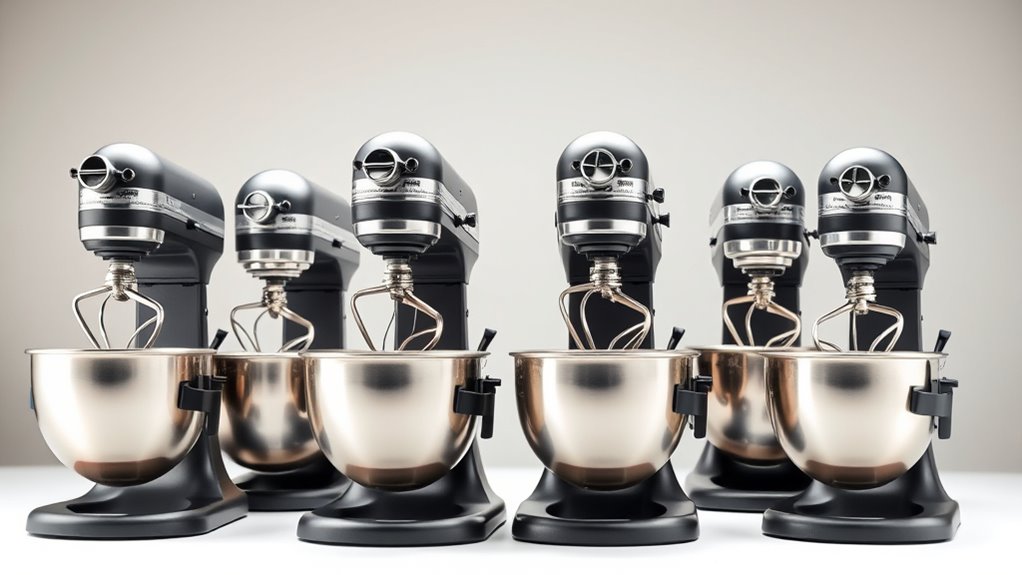 Imagine you’re mixing a large batch of dough when suddenly, the mixer stalls—scary, right? Luckily, these mixers include safety features like automatic shut-off if overheating occurs, preventing damage or accidents. I’ve seen professional kitchens prioritize safety, and these features keep everyone protected during busy hours. So, you can focus on your culinary creations without worry, knowing these mixers are built with safety in mind.